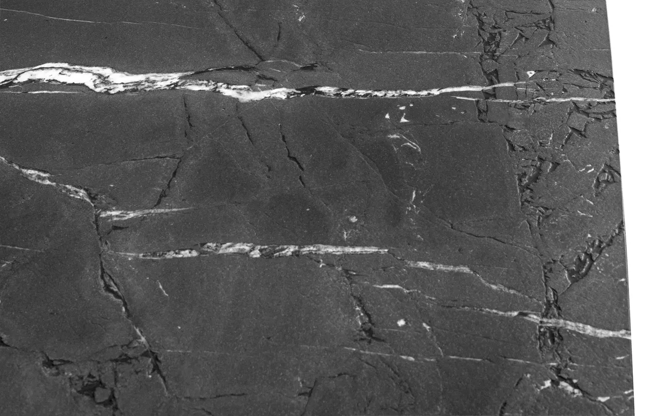 Blat stołu wykonany jest z unikatowego kwarcytu Infinity Dark, naturalnego materiału, który do złudzenia przypomina surową, górską skałę. Kwarcyt jest skałą metamorficzną, niemal w całości zbudowaną z kwarcu mineralnego, dzięki czemu każdy jego detal – przerosty, mikro-pęknięcia czy nieregularna faktura – jest absolutnie niepowtarzalny.