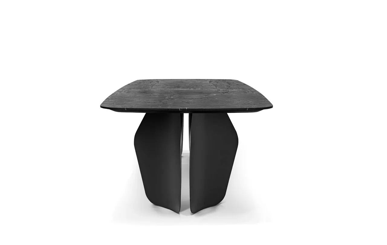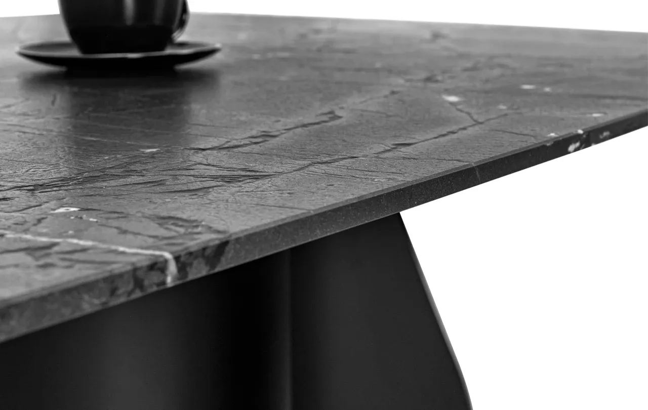 Podstawa stołu wykonana jest z metalu malowanego proszkowo w czarnym macie, co w połączeniu z naturalnym kwarcytem tworzy harmonijną i nowoczesną całość. Metalowa konstrukcja gwarantuje stabilność i trwałość stołu, a jednocześnie podkreśla jego minimalistyczny, elegancki charakter.