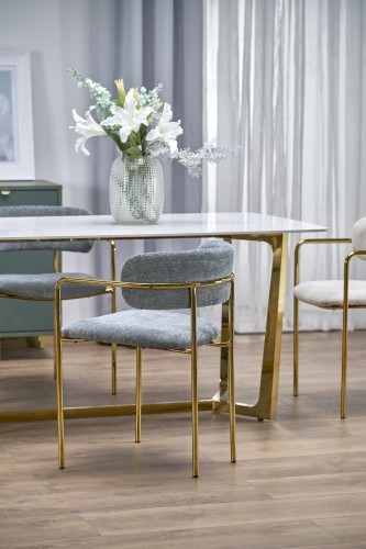 Całość oparta została na stabilnej konstrukcji ze stali nierdzewnej, pokrytej złotym wykończeniem. Złote nogi wprowadzają do wnętrza ciepły, luksusowy akcent, który pięknie współgra z jasnym blatem i doskonale odbija światło – zarówno naturalne, jak i to z żyrandola czy lamp stojących.