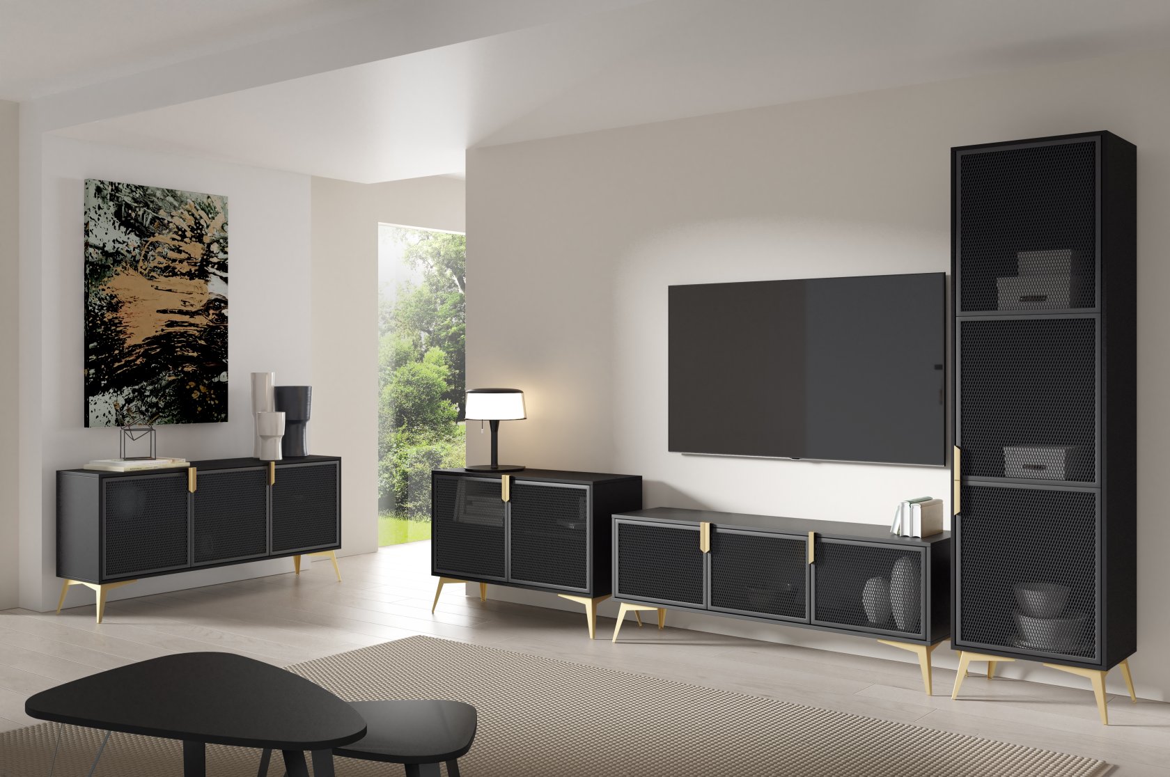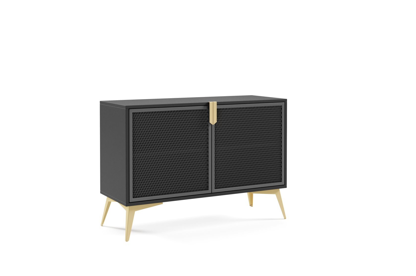Nowoczesne komody z serii „BRAVIO” wyróżniają się minimalistycznym designem i wysoką jakością wykonania. Ich charakterystyczną cechą są fronty pokryte metalową siatką o drobnym splocie, która łączy estetykę przemysłową z elegancją. Detale w kolorze szczotkowanego złota na nóżkach i uchwytach nadają całości prestiżowy wygląd. Idealne do salonu, sypialni lub biura.Komoda 2 – dzielna:* Długość: 110 cm* Szerokość: 42 cm* Wysokość: 77 cm