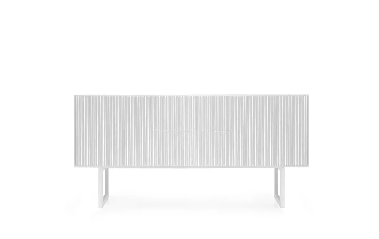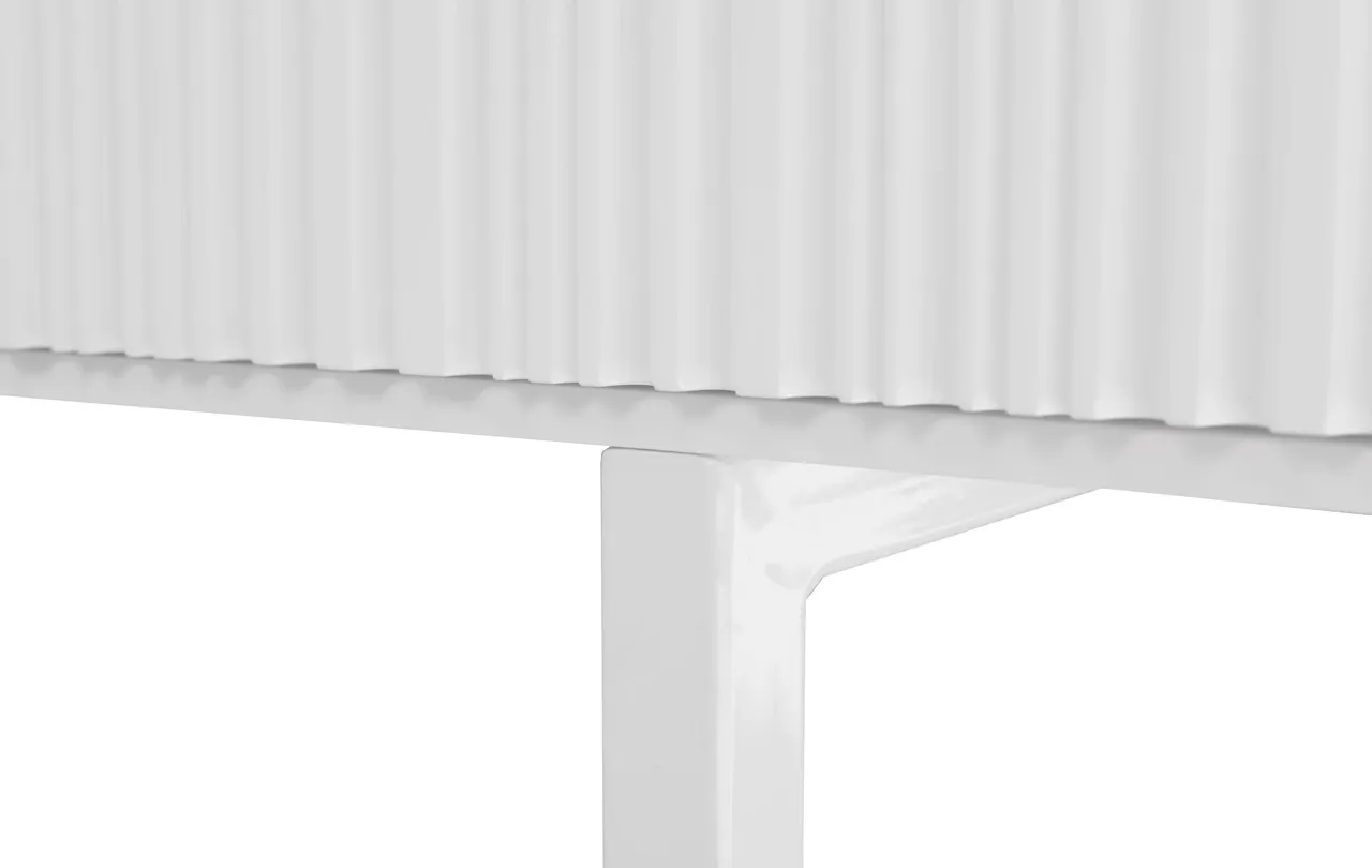 Fronty komody Esmeralda zostały wykonane w innowacyjnej technice frezowania, tworząc charakterystyczny, harmonijkowy wzór, który przyciąga wzrok i nadaje meblowi niepowtarzalny charakter. Korpus został wykonany z MDF lakierowanego w dowolnym kolorze z palety RAL, co pozwala dopasować komodę do każdego wnętrza. Białe nogi nadają lekkości konstrukcji, podkreślając nowoczesny styl mebla.