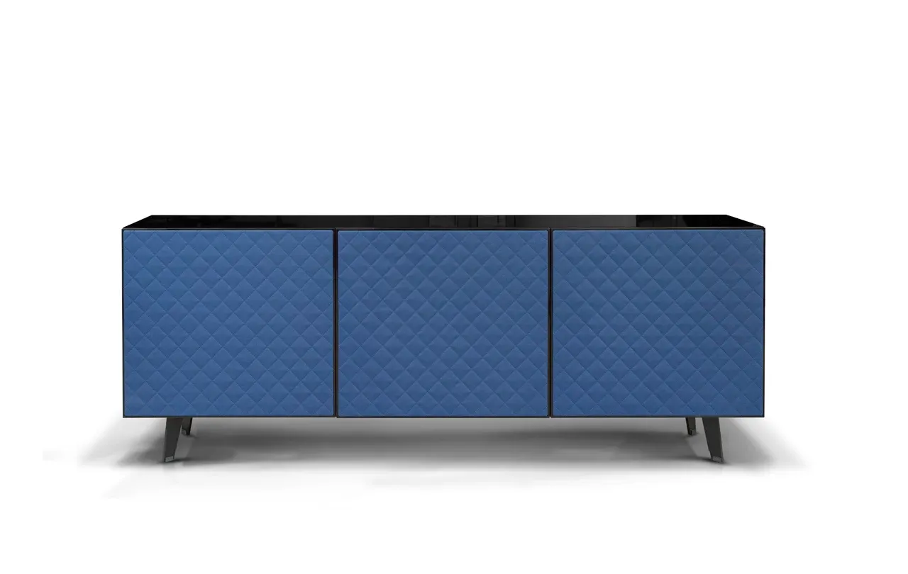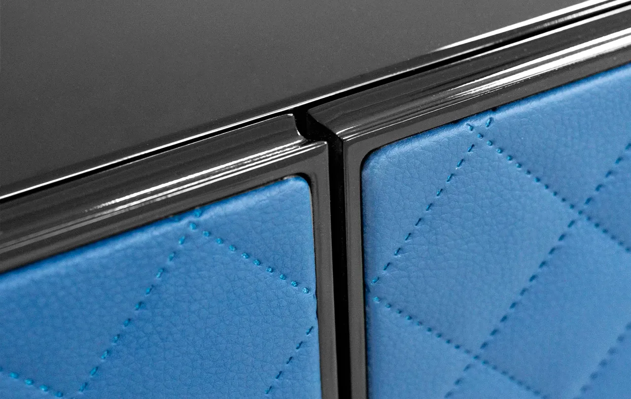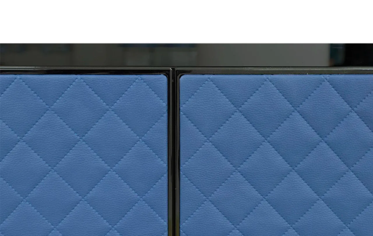 Poznaj komodę, która łączy w sobie najwyższej jakości materiały, elegancję i nowoczesny design. Fronty komody wykonano z granatowej eco-skóry, której głęboki, intensywny kolor pięknie komponuje się z każdym wnętrzem. Każdy front został ozdobiony frezowanym, lakierowanym rantem, który dodaje meblowi prestiżu. Otwieranie komody to czysta przyjemność dzięki systemowi push-click, który działa lekko i bezgłośnie.