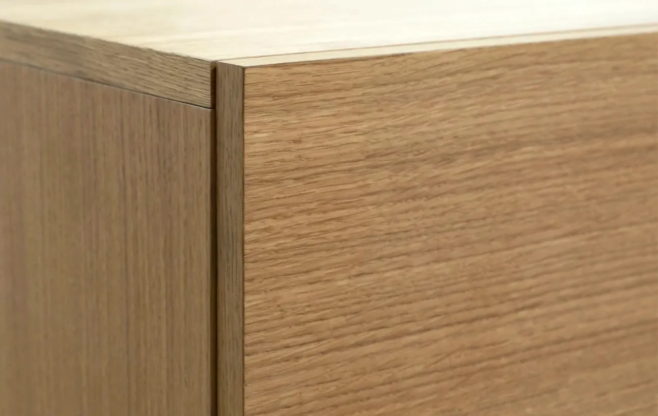 To, co wyróżnia komodę Nicola, to fornir dębowy wykorzystany zarówno na frontach, jak i na korpusie. Dzięki niemu każdy egzemplarz jest nieco inny – unikalny, jak drewno, z którego powstał. Mebel jest lakierowany najwyższej jakości włoskimi lakierami, co podkreśla rysunek naturalnych słojów, a jednocześnie zabezpiecza powierzchnię na lata.