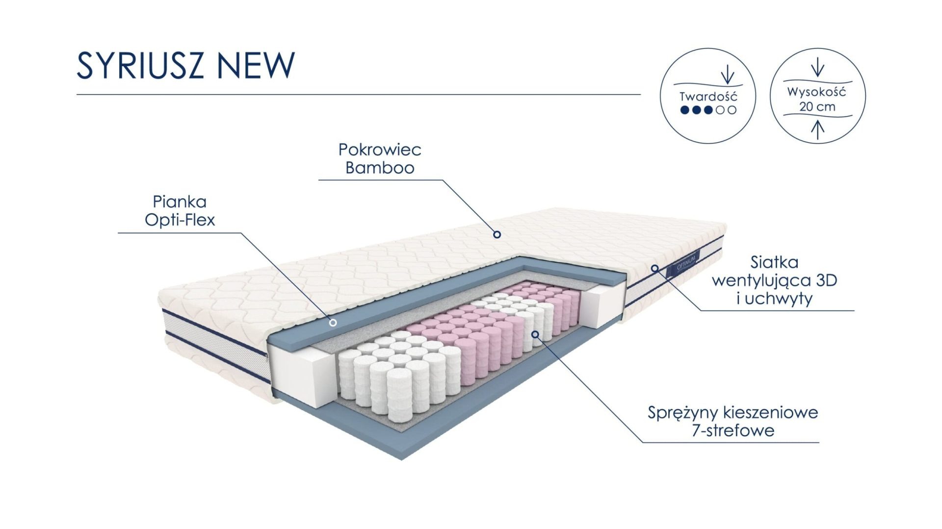 Syriusz New to nie tylko materac – to inwestycja w zdrowy sen i sprawny kręgosłup. Połączenie pianek Opti-Flex i sprężyn kieszeniowych 7-strefowych zapewnia precyzyjne podparcie, a naturalny pokrowiec z bambusa dba o świeżość i komfort. Każdy sen staje się okazją do regeneracji ciała i relaksu umysłu, dzięki czemu rano budzisz się wypoczęty i pełen energii.