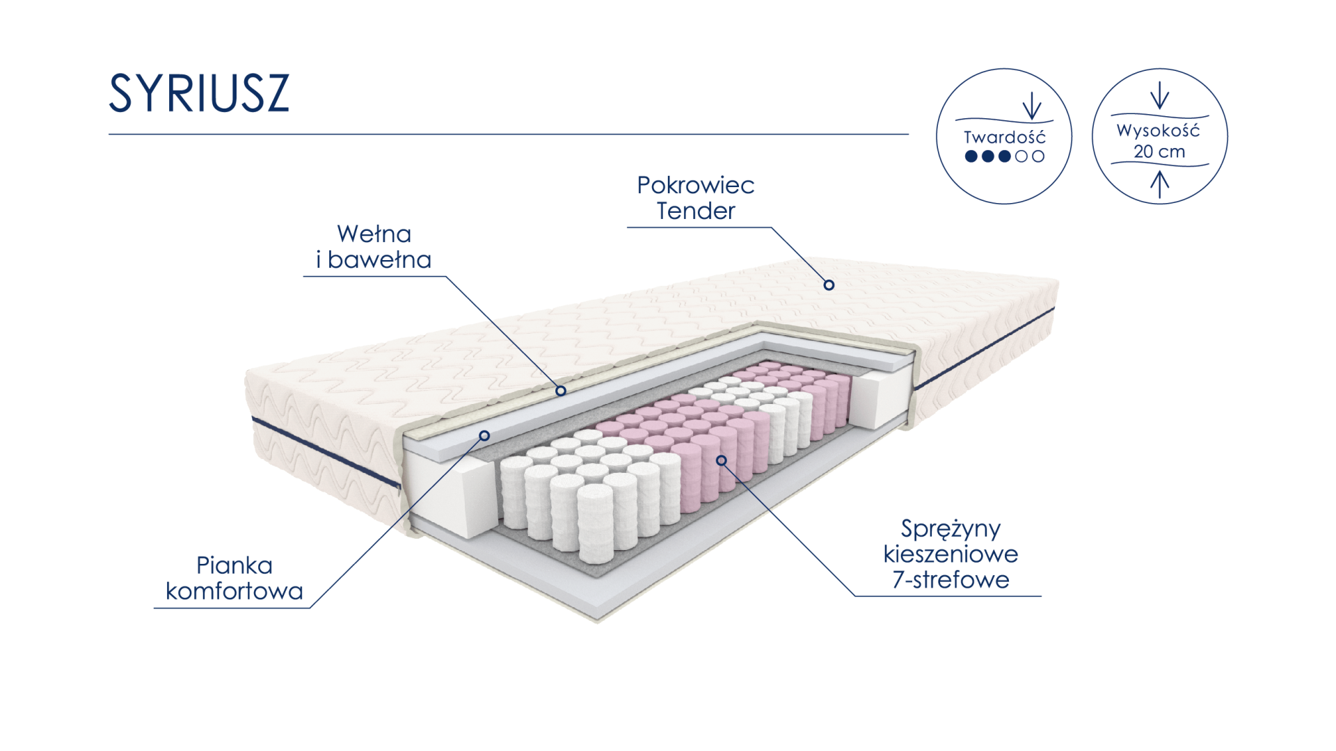 Materac Syriusz to połączenie starannie dobranych materiałów, które wspólnie zapewniają zdrowy i komfortowy sen: