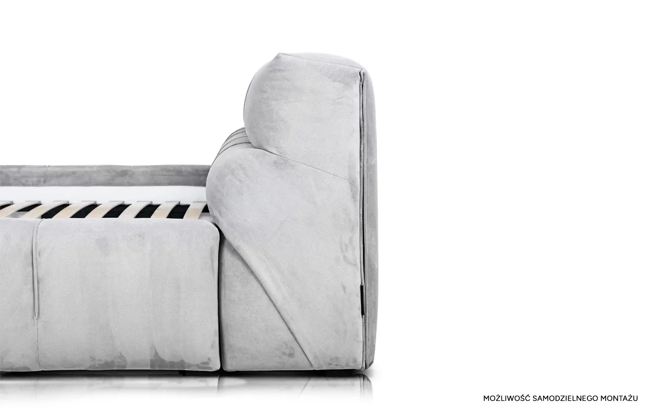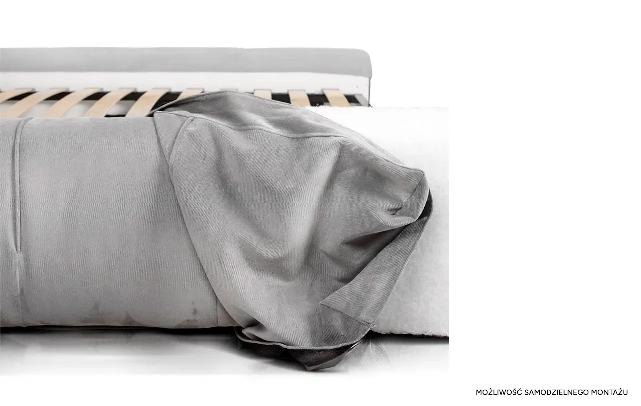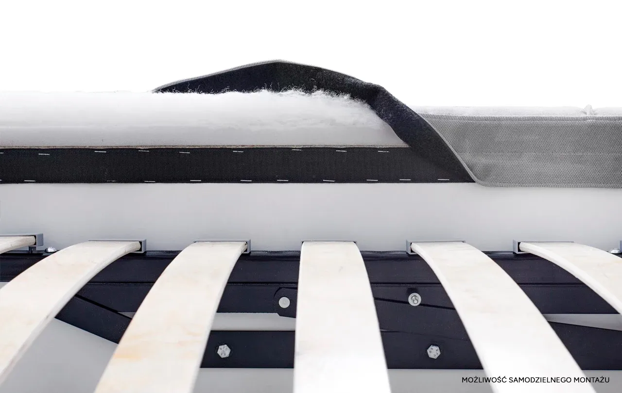 Skrzynia do samodzielnego montażu – bez widocznego łączenia elementów ramy. Materiał mocowany jest na rzep, a łóżko wysyłane w kilku częściach.
