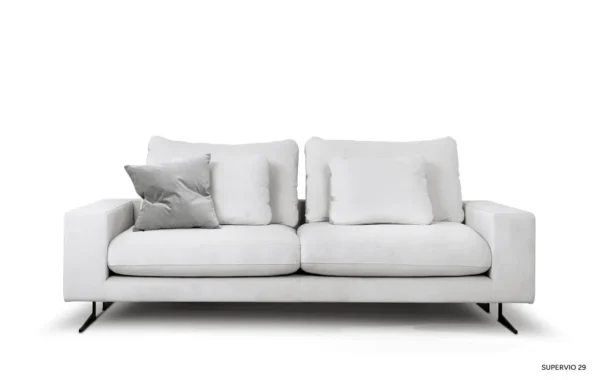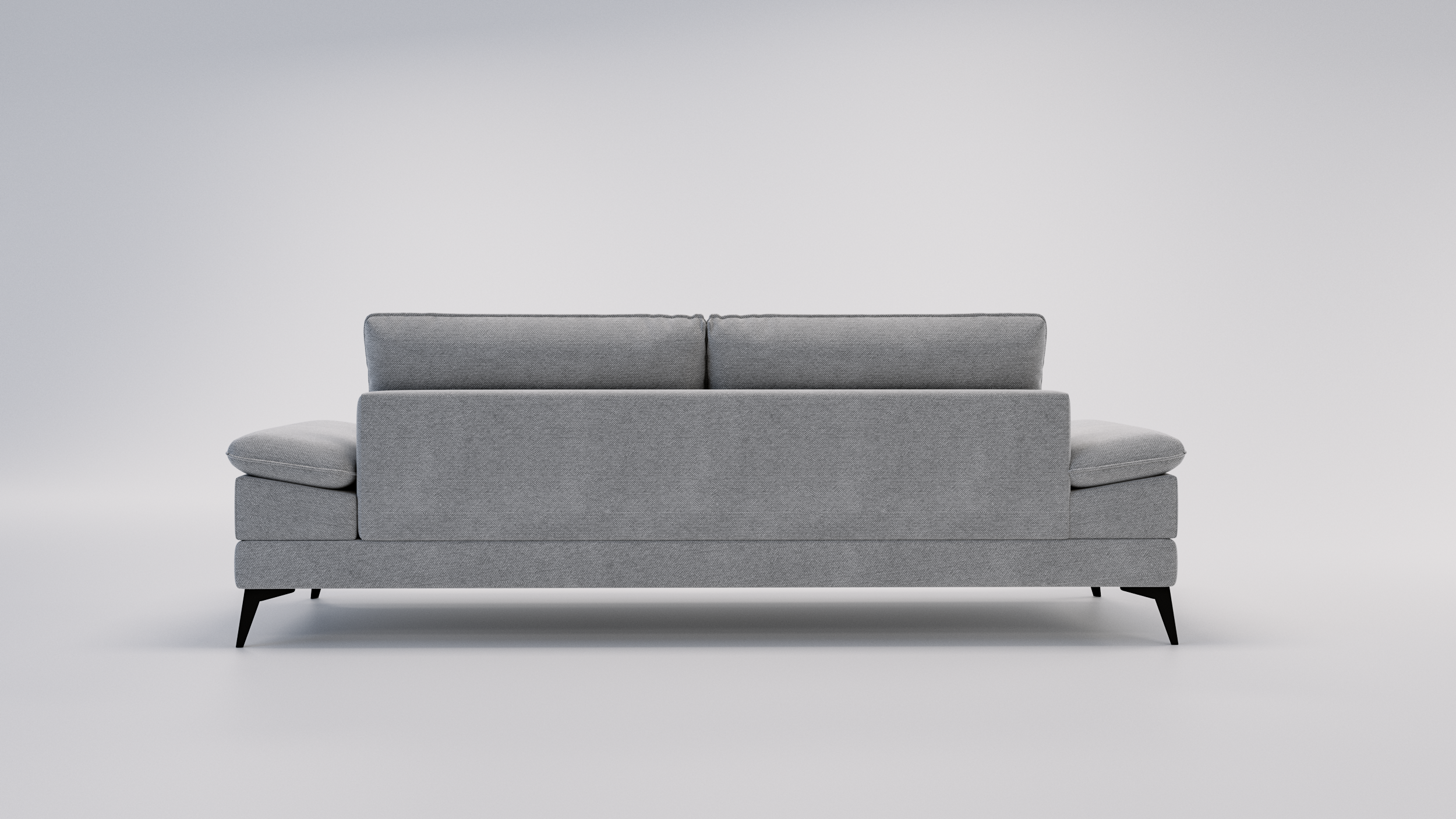 Jej forma jest lekka wizualnie, a jednocześnie solidna i stabilna. Szerokie podłokietniki (40 cm) nadają sofie elegancji i równowagi, stanowiąc przy tym wygodne oparcie dla rąk. Smukłe, metalowe nóżki o wysokości 16 cm optycznie unoszą bryłę mebla, dodając jej lekkości i nowoczesnego charakteru.
