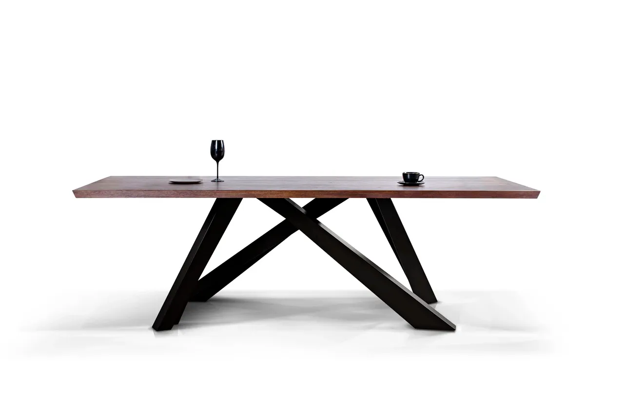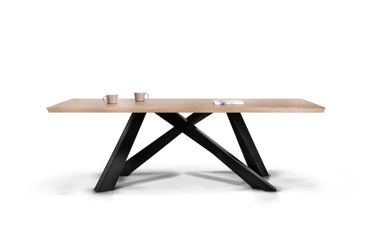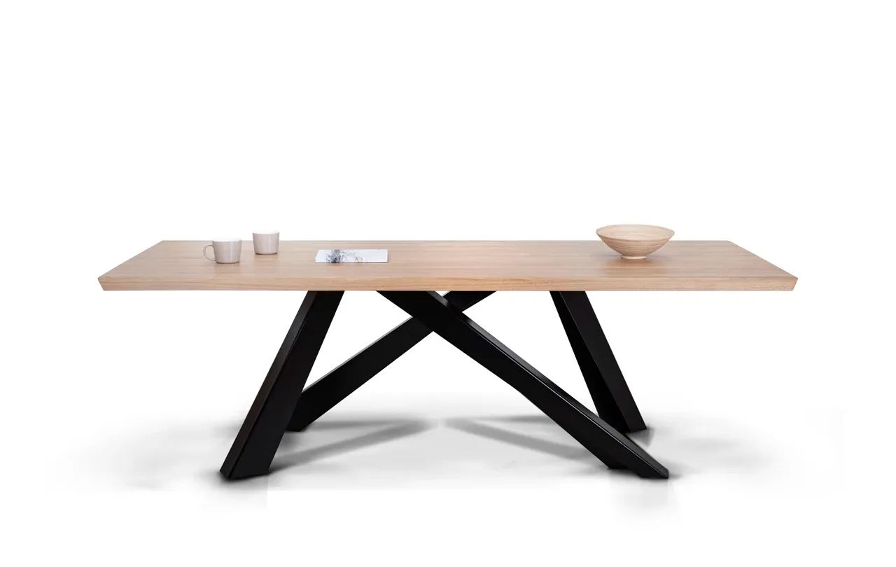 Stół Tame to prawdziwy lider w swojej kategorii – mocny, charakterystyczny i zaprojektowany tak, by zwracać uwagę od pierwszego spojrzenia. Jego solidne, metalowe nogi zestawione z masywnym, wykonanym z litego dębu blatem tworzą harmonijną, a jednocześnie odważną kompozycję. Połączenie różnych kątów i kształtów sprawia, że mebel wygląda jak małe dzieło sztuki użytkowej, które z łatwością stanie się centralnym punktem salonu, jadalni czy gabinetu.