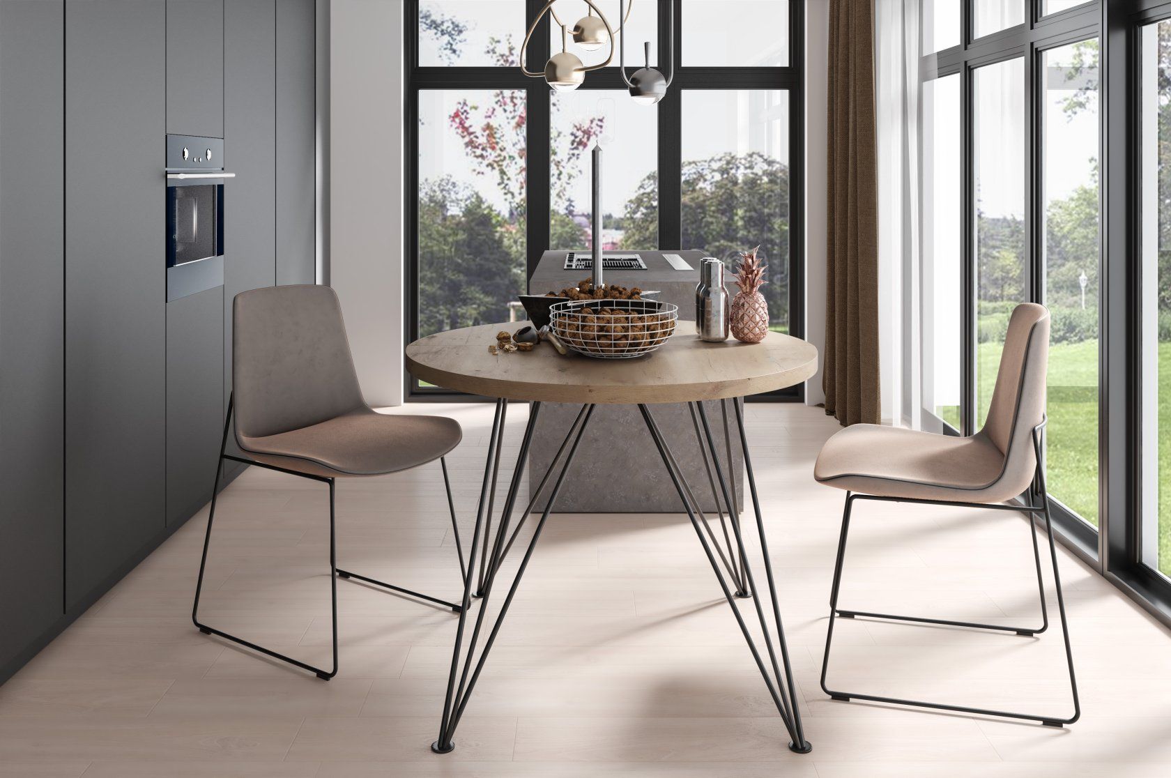 Stół Tiago to okrągły stół o niebanalnej podstawie, która przypomina nogi pająka. Idealnie sprawdzi się w nowoczesnych salonie w industrialnym stylu, który teraz jest tak bardzo na topie.Dane techniczne:• Blat wykonany jest z płyty laminowanej• Grubość blatu 36mm• Nogi: Metalowa rurka ⌀12 mm malowana proszkowo