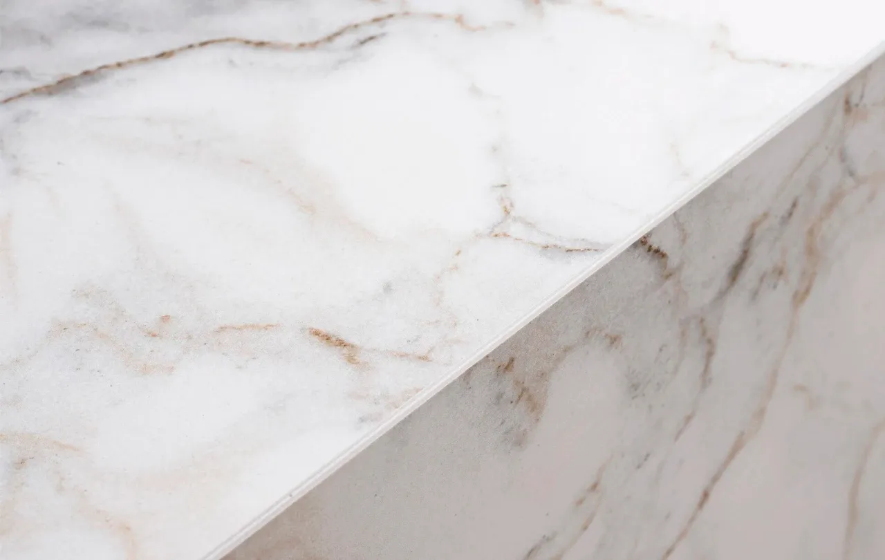 Stolik Amaral został wyposażony w blat z ekskluzywnego spieku kwarcowego Calacatta Gold, materiału, który zachwyca nie tylko wyglądem, ale i wyjątkową wytrzymałością. Ten nowoczesny surowiec jest odporny na zarysowania, wysokie temperatury, zabrudzenia oraz działanie chemikaliów, co sprawia, że idealnie sprawdza się w codziennym użytkowaniu.