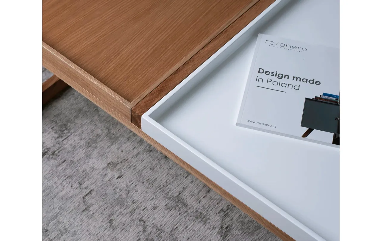 Stolik kawowy Domino mały wyposażony w dwa ruchome blaty w formie tac oraz stabilną podstawę z litego drewna dębowego, zachwyca stylem i praktycznością. Polski produkt marki Rosanero – elegancki, trwały i dopasowany do Twojego wnętrza.