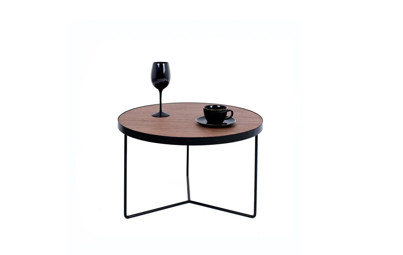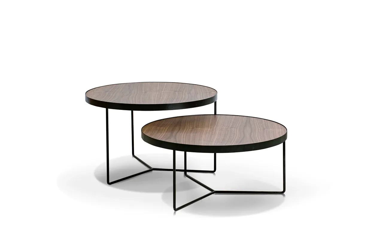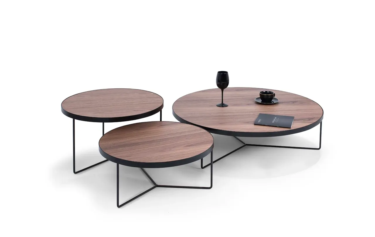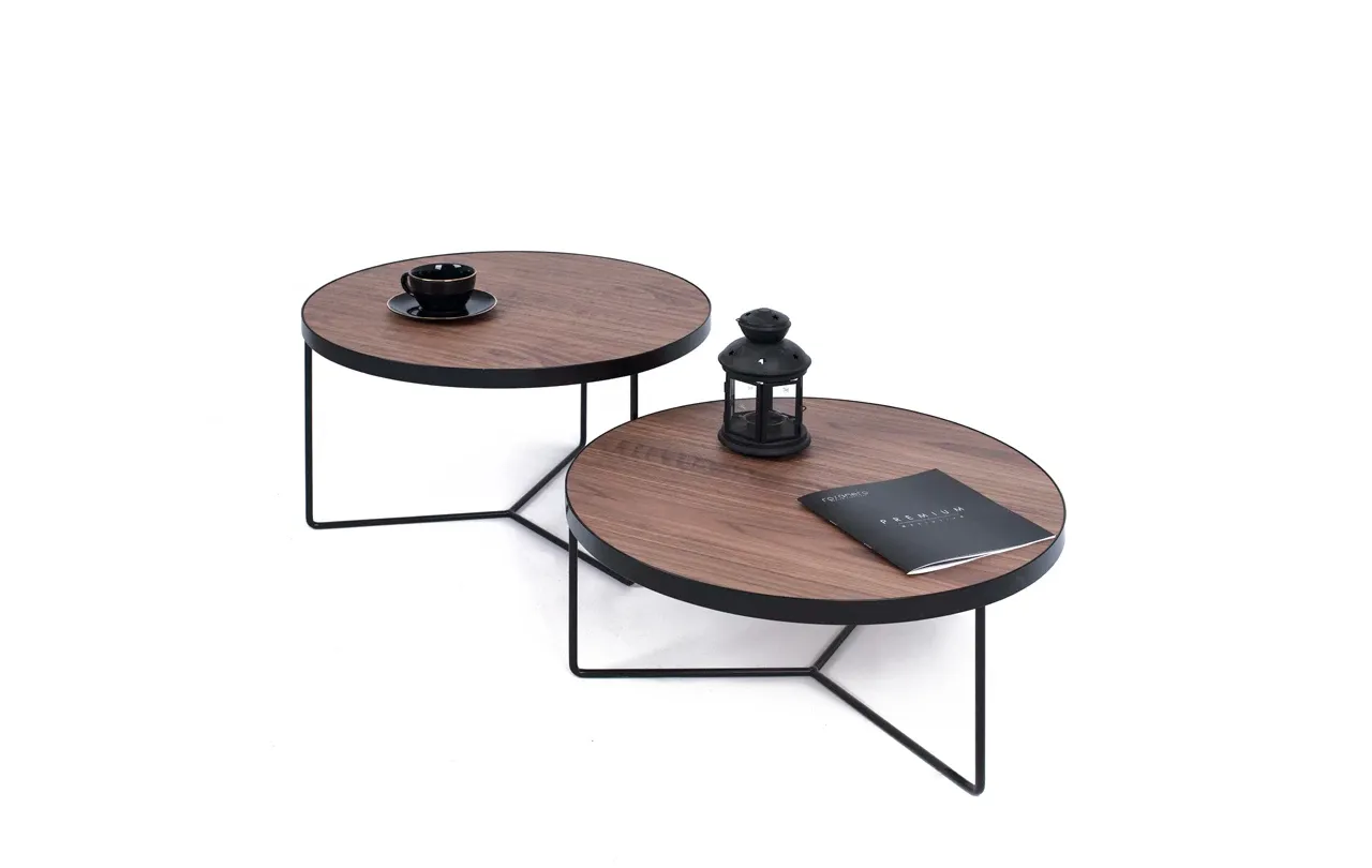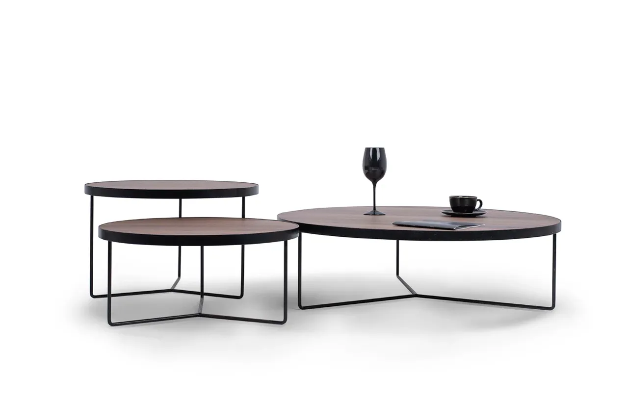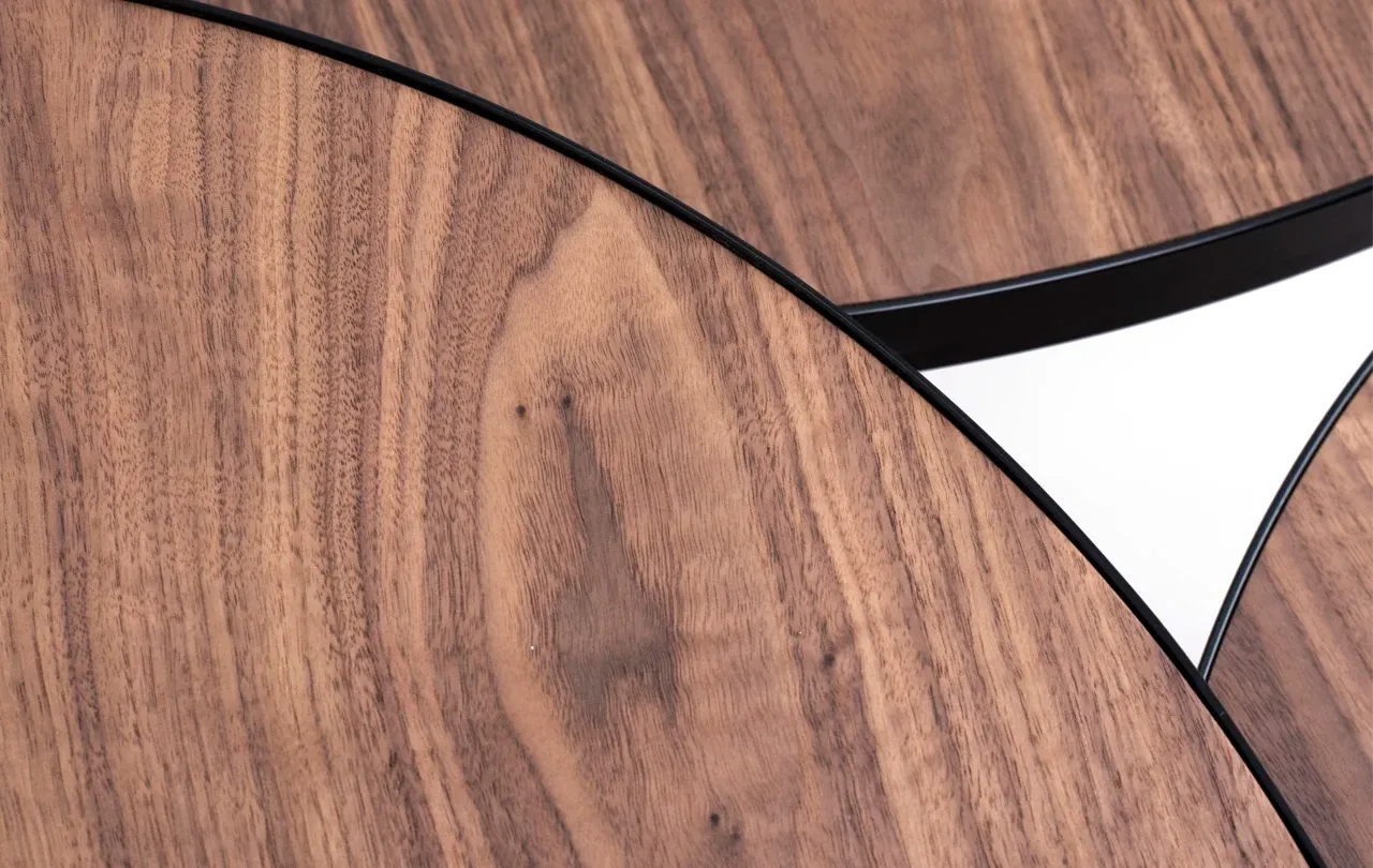 Blaty stolików wykonano z forniru orzecha amerykańskiego, materiału znanego z niezwykłej trwałości i subtelnej, szlachetnej faktury. Ciepły odcień drewna idealnie komponuje się z nowoczesną podstawą z czarnej, proszkowo lakierowanej stali, tworząc zestaw, który łączy w sobie naturalny urok drewna i industrialną surowość metalu. Efekt? Meble, które zachwycają zarówno estetyką, jak i funkcjonalnością.
