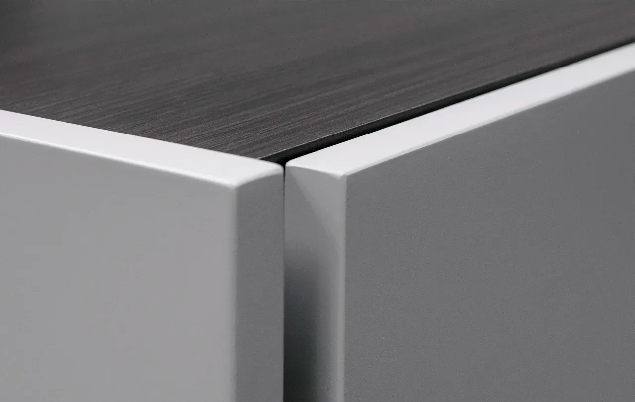 Starannie dobrane materiały: MDF lakierowany, fornir dębowy oraz najwyższej jakości okucia BLUM gwarantują trwałość i komfort użytkowania.