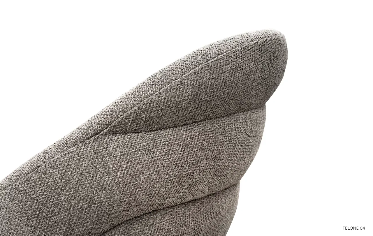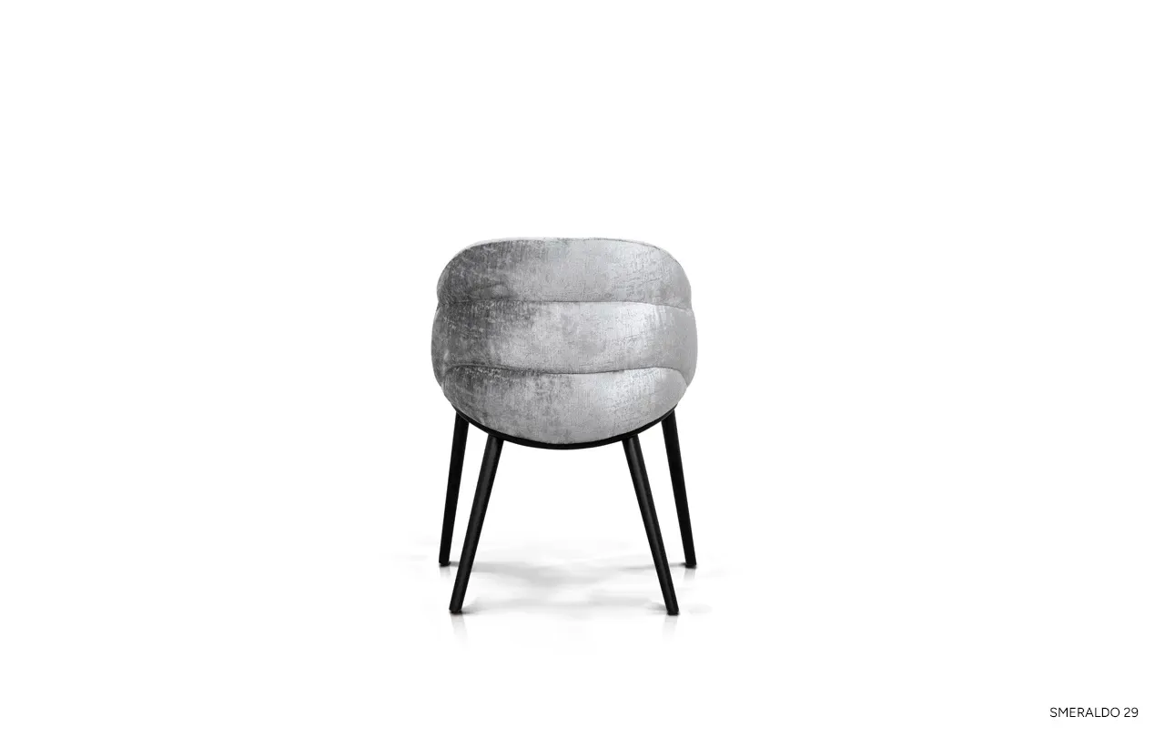 Siedzisko i oparcie krzesła wypełniono wysokoelastyczną pianką poliuretanową oraz pasami tapicerskimi, co zapewnia optymalne podparcie dla pleców i wygodę nawet podczas długiego siedzenia. Delikatne wyprofilowanie oparcia doskonale dopasowuje się do sylwetki, a miękka, przyjemna w dotyku tkanina podkreśla luksusowy charakter mebla.