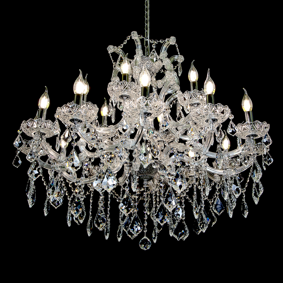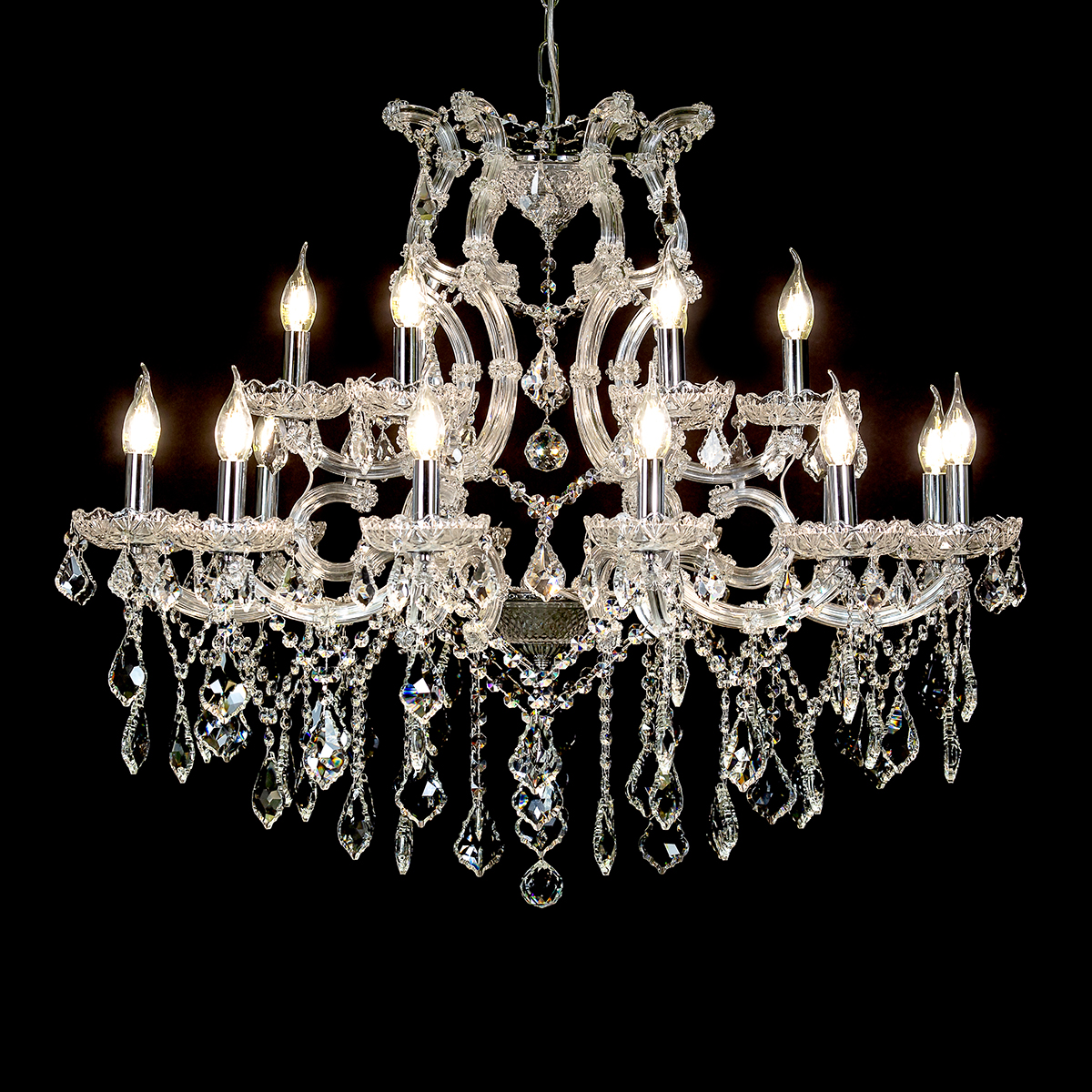 Maria Teresa to ponadczasowy model oświetlenia kryształowego, który bez względu na obecnie panującą modę, zachwyca swym blaskiem. Doskonale wpasowuje się w klasyczne aranżacje wnętrz, a także stanowi niezwykle intrygujące przełamanie nowoczesnych aranżacji. Ten konkretny model żyrandola został pokryty chromowaną galwanizacją, dzięki czemu szkielet lampy uzyskał kolor srebrny. Nadaje to niezwykłej elegancki, a także swego rodzaju nuty glamour do aranżacji wnętrza.