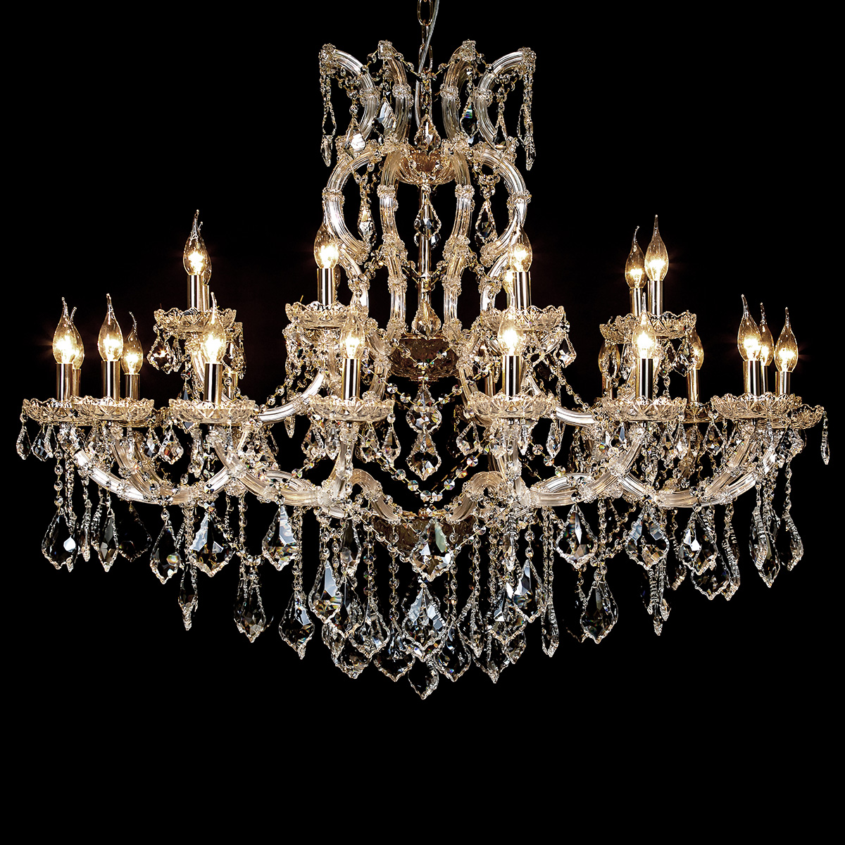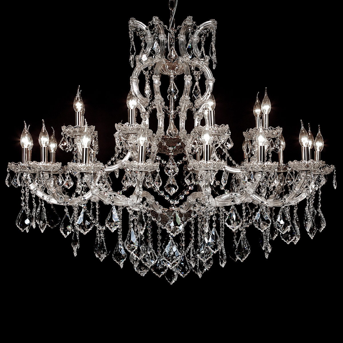 Niezwykle elegancka lampa świecznikowa z kolekcji Maria Teresa w kolorze srebrnym. Dodaje szyku i ponadczasowego, unikalnego tonu każdemu wnętrzu. Odsłonięte żarówki swym wyglądem przypominają klasyczne świecie, a dołączone do szkieletu kryształy talerzykowe przepięknie załamują światło. Ten okazały model żyrandola posiada aż 24 punkty świetlne, co sprawia, że lampa doskonale doświetla większe przestrzenie. Aranżację oświetlenia można uzupełnić pasującymi kinkietami z kolekcji.