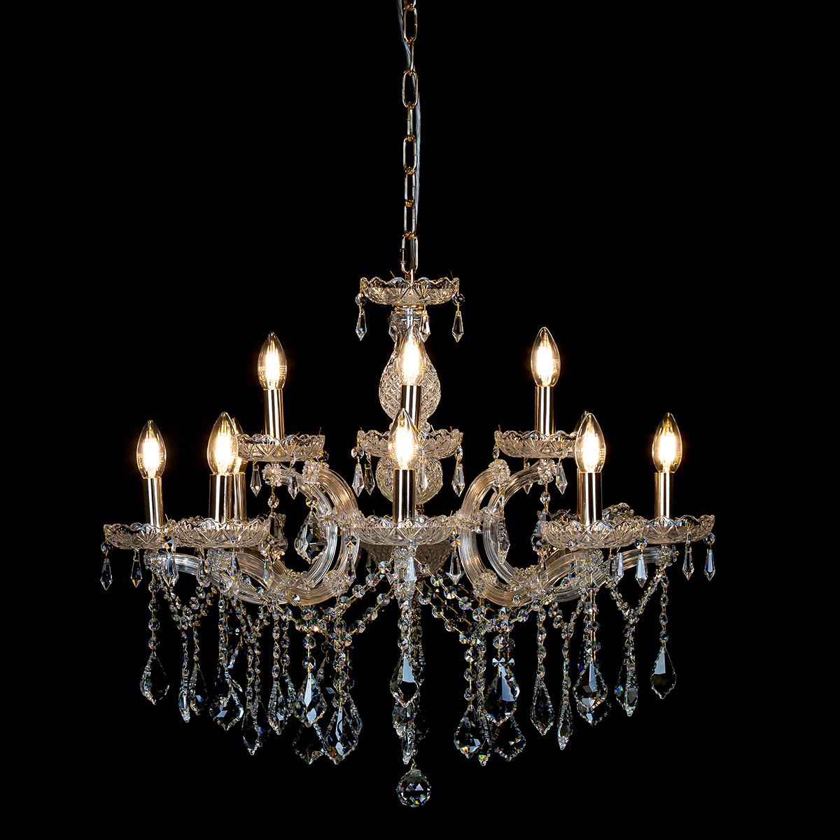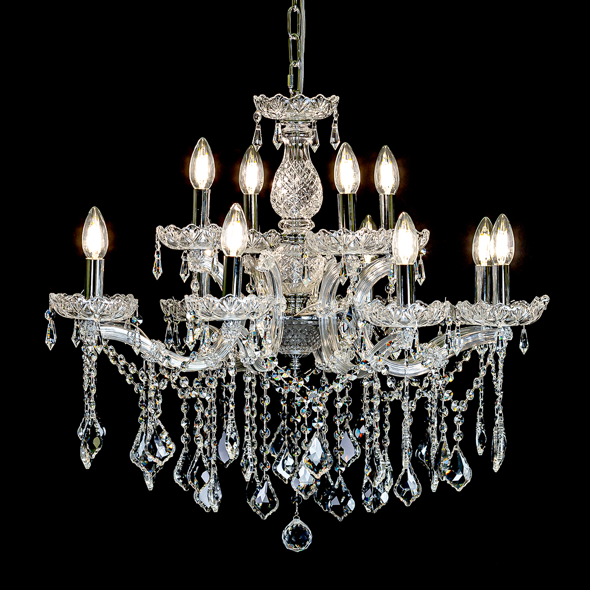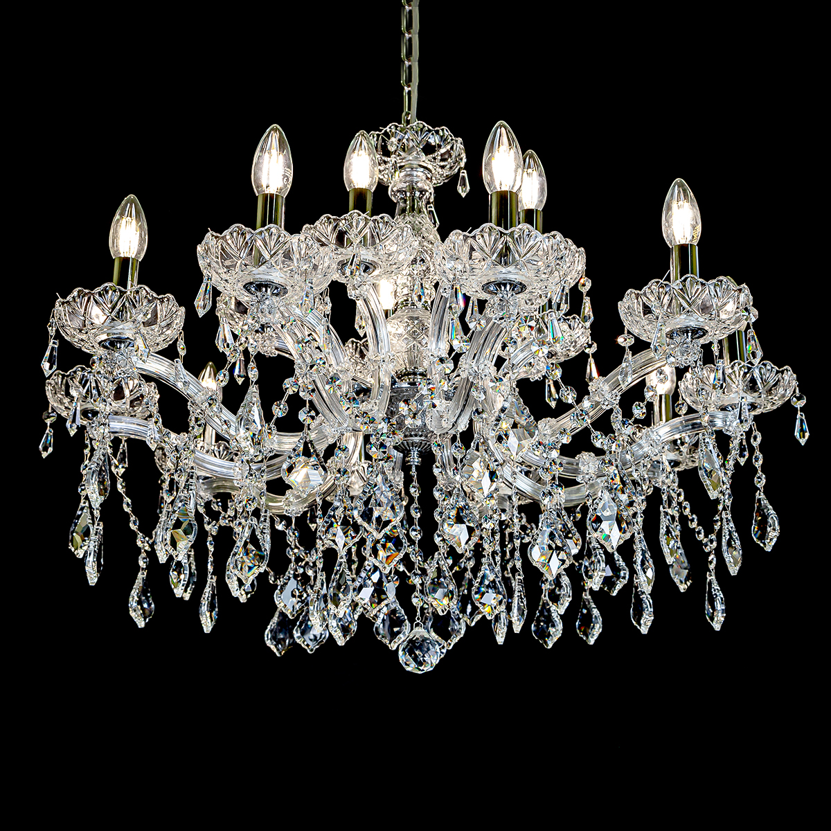 Ten okazały kryształowy żyrandol to doskonała propozycja dla miłośników klasycznych aranżacji wnętrz. Dwa poziomy tzw. elementów świecznikowych i łącznie 12 punktów świetlnych zadbają o klimatyczny nastrój, którego nie jest w stanie zapewnić żadna inna lampa. Lampa została pokryta chromowaną galwanizacją, co oznacza, że kolor szkieletu oraz łańcucha jest srebrny, co wprowadza swego razu chłodną, lecz niezwykle szykowną elegancję do pomieszczenia. Żyrandol kryształowy Maria Teresa sprawdzi się również doskonale we wnętrzach w stylu glamour, jako intrygujące przełamanie klimatu panującego we wnętrzu.